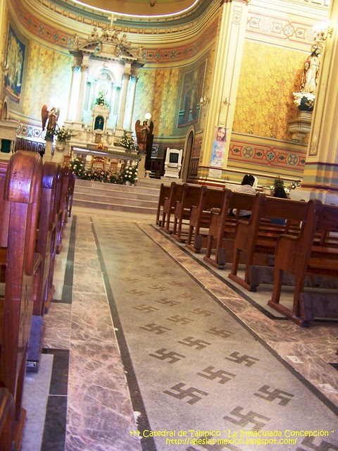 En la catedral de Támpico, México, se exhibe la esvástica nazi en el piso del pasillo central. Los líderes religiosos defienden esos adornos con toda clase de argumentos falsos para atontar las mentes de los feligreses.